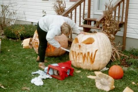 "THIS IS MY PUMPKIN CARVING MANIAC SISTER KAREN HARD AT WORK--IF I DID IT MY POOR BOYS WOULD HAVE TRIANGLE EYES, NOSE AND MOUTH !!"