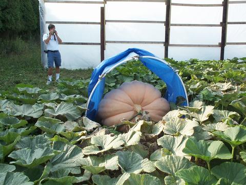 Alan was growing two 723 Bobier plants. This pumpkin is the smaller of the two taping at 311 OTT for an estimated weight of 607 pounds. Bob Mathews from the Pumpkin Nook website is taking a picture from the other side of the fruit.