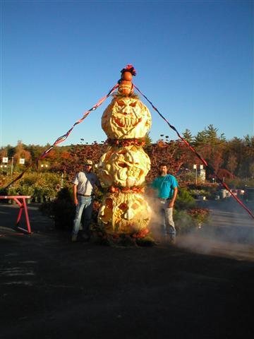 Carved Giant Pumpkin Totem Pole by Scott Cully.