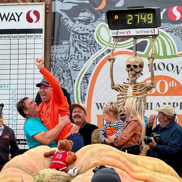 Travis Gienger weighed the his new World Record giant pumpkin in Half Moon Bay, CA at the Safeway World Championship, 2749 pounds grown on the 2365 Wolf and sibbed.