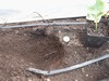 The selected planting site was carefully dug out and one section of heating cable was discovered. This also shows the depth the cables are placed and the drip tapes are also moved to a greater spacing to avoid soaking the area which will only increase the odds of rot at the all important crown region of the plant.