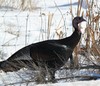 A turkey with cold feet looking for something to eat.