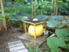 Fruit is under the shade shelter which I plan to extend tonight. Water container to left and hose for irrigation runs along soil under vine.