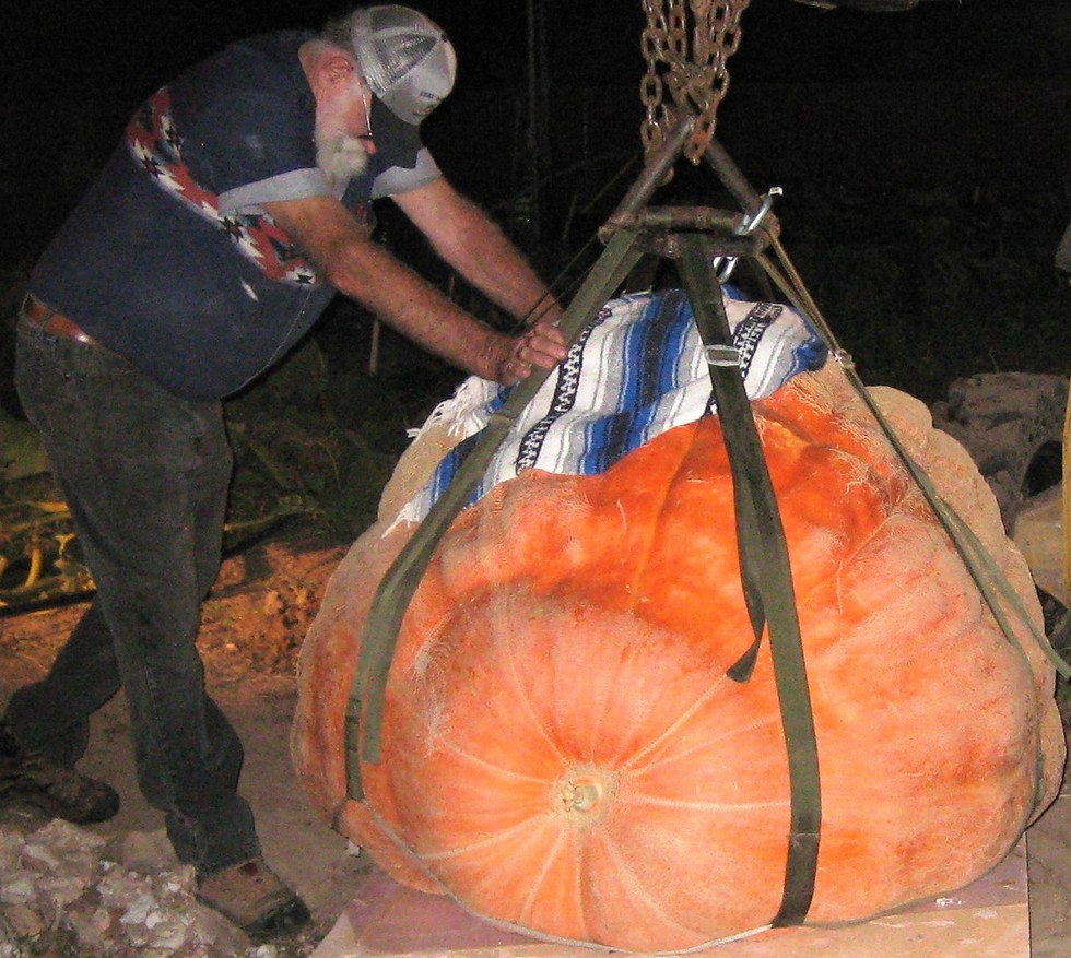 This is the first pumpkin lifting ring I made. Ring was made out of pipe and welded together. This is my 819.5 pumpkin grown from Julie Young 1354.