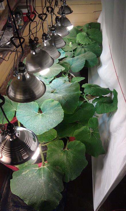 This is my squash plant. It's at 9ft long. Plus, this is the set up I had with my lights. I'm growing this in my basement now. I have a secondary vine growing as well, at 5ft long.