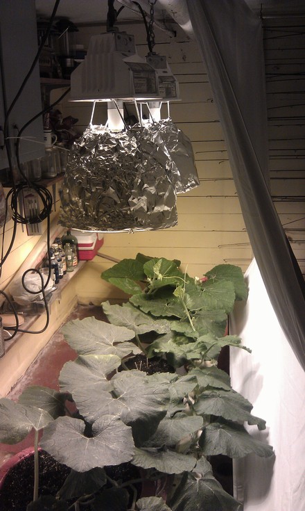 Picture of final set up with lights. (2)400 watt fixtures. White sheet is being used to reflect light back to plant.
