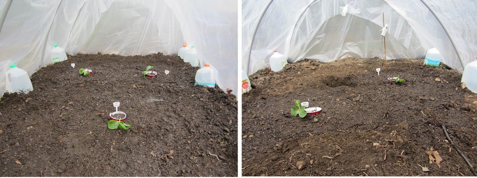 Five of the seedlings have been planted in the hoop houses. One 454 LaRiviere 2013, three 432 Wexler 2013(UOW), and one 1463.5 Hoelke 2013. Pumpkin power was worked into the beds and two brands of Mycorrhizae fungi was worked into each planting site. The 282 Scherber has been very slow to germinate.