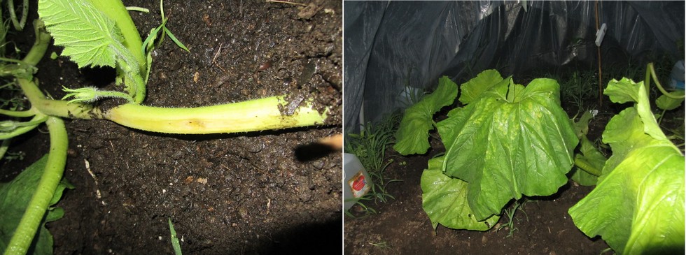 I don�t like the look of the main vine on the 1463 Hoelke. About two feet from the base there is a one foot section of main vine that is yellowing and has a soft spot. I don�t see any insect damage. I'm going to need to do some research to determine what is going on. There is about three feet of healthy plant after this spot.