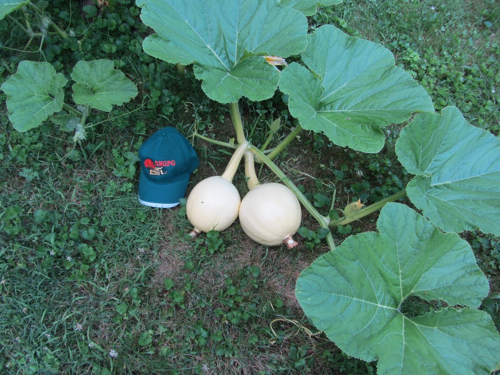 The 282 Scherber is slow but steady, it�s about 22 feet long. Oddly it has very few side vines and the only females blossoms set at the same leaf axis. The twins are about the size of cantaloupes, we need to determine which one to keep. The smaller one has a better stem location coming off the side of the vine. Whereas the larger pumpkins stem comes off the bottom of the vine.