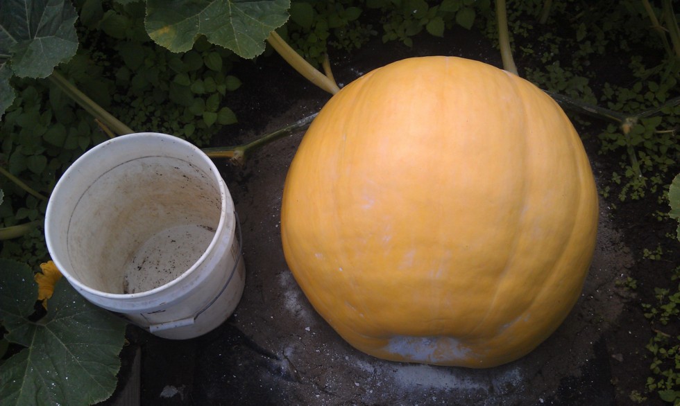 Pollinated August 9th, so 22 days old. No measurement, but 5 gallon bucket is for comparison. Growing like crazy. all vine terminated already.