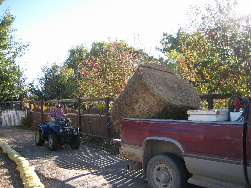 Unloading the bale with Dori's wheeler.