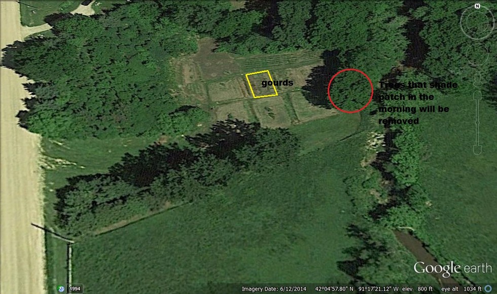 This is a close-up view of the garden. It looks like it was taken mid morning around the first of June, 2014. The gourds in the middle were the only part of the garden that did well after the big flood that hit at the end of June. There are some trees along the creek that shade the garden in the morning. The flood cut the bank real close to them and another one like it might drop them. So this spring Jacob and I will cut up the trees for firewood. We will anchor pine trees on the base of the bank to catch sand and heal up the bank so it doesn't erode into the garden. Jacob and I did our best to thin out the deer herd last fall and so did our neighbors.