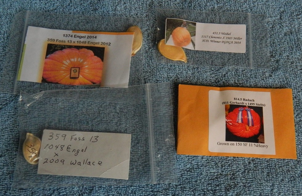 We usually grow some pumpkins for good color and some for size. Usually The orange ones seem to get bigger anyway. We ended up with seeds from 4 Howard Dill winners to go along with Jacob's winner from 2011 It is going to be hard to choose which ones to grow this year. What ever doesn't get planted this year will be saved for next year.