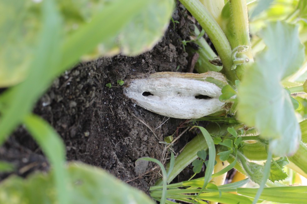 I spent much of the day yesterday burying vines since I had fallen behind. Today I worked on the cucumber beetles. They were out of control just a few days ago, but with a spraying of neem oil and lots of tedious squishing, I think I have gotten them under control. I also applied a Captan paste on the stump to help it dry out and prevent it from rotting. I also have a fan blowing on it right now. The stem split as a seedling on a windy day, but the plant has been doing fine despite that. What doesn't kill you makes you stronger, right?!