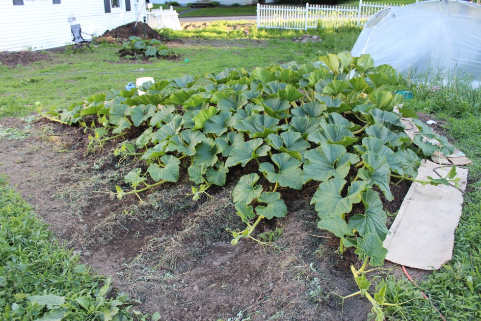Oh, and I forgot to mention. I had a baby pumpkin at 9 feet which I got rid of. I have another around 10 feet which I'll also get rid of, and I just saw a baby pop up at 14 feet. That will probably be the one! The main vine is 15 feet, and I FINALLY got around to getting some boards down to prevent soil compaction (bad Sarah). Hopefully my organic methods will allow the earthworms to thrive and make up for my negligence. I also read online about how to use a pitchfork to aerate your soil which I might give a try.
