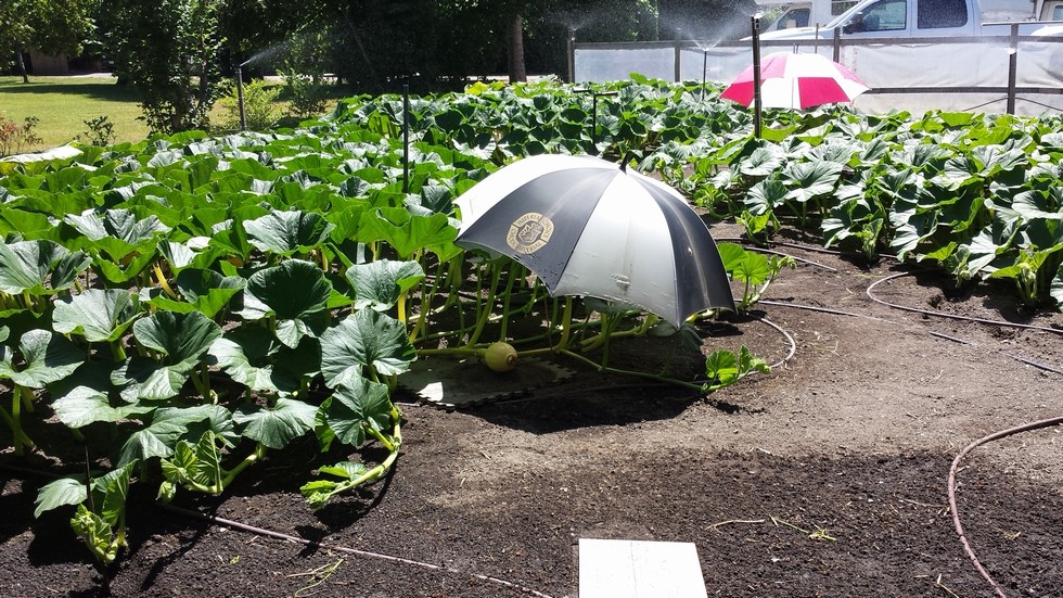 Once the pumpkin has "taken" you need to protect its delicate skin from being sunburnt. Old golf umbrellas work well. In a few days we will be erecting a sun cover. I'll submit construction pics in a few days.