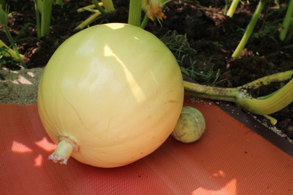 1400 Lopresti, 13 DAP. I think she's a keeper! My back-up pumpkin is about the size of a baseball right now. The next pumpkin down on the main vine hasn't opened yet, but it looks like she might be a 7-lober based on the number of filaments on the flower.
