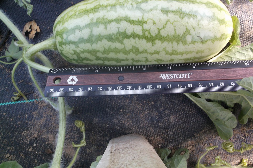 Can't set a melon on the 123 Spencer right now. Too HOt a nd it will be hot for the next 10 to 15 days. Heat indexes around 108 to 111. BUT......this one OPEN pollinated. Didn't see it until today By the color and the size and based on I didn't see it when I tilled around the patch.....I say its 6 DAP. And it's 7 1/2 inches long. Bad location. I will keep it until I can get another one set...which i doubt.