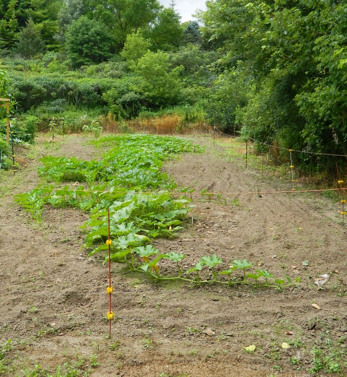 View of the main field pumpkin patch with pretty decent weed control. 11 plants here, 2 more in the main garden. If I can afford to rent a machine this fall, I will lower this spot by 15" and use the soil to raise the main garden. Hopefully I can get the main garden higher than most floods. And with my bad knees and shoulders I don't need the extra work. If I don't get the dirt moved this fall, next year it will be planted to deer food and soil building crops.