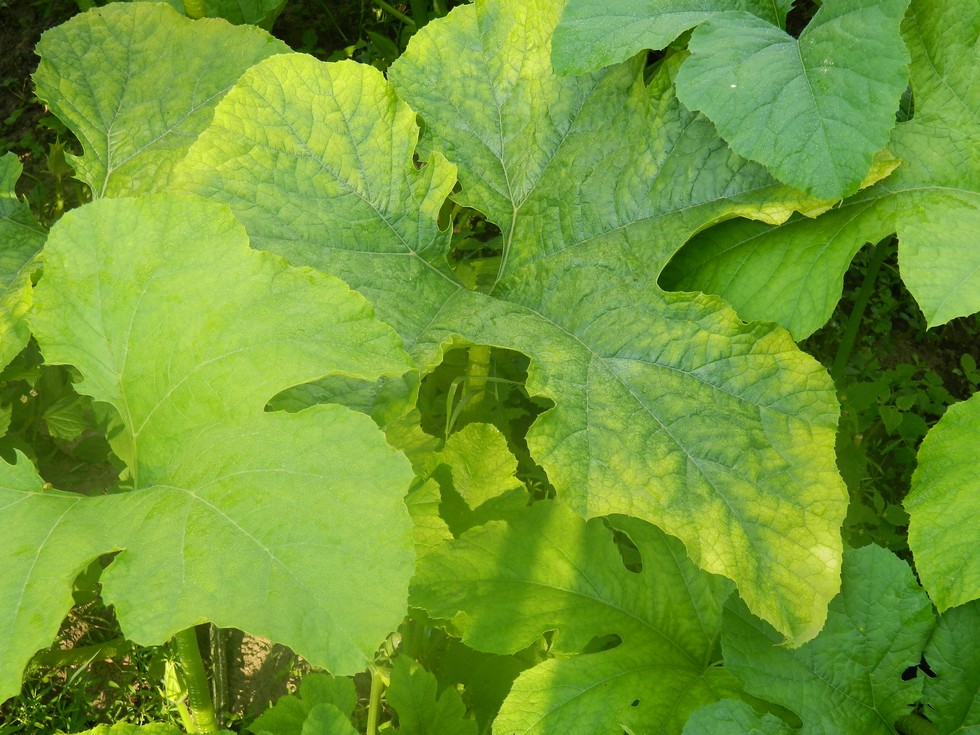 we have some leaves on another field pumpkin that started going yellow. I'm not sure what the cause is, but I suspect nutrient deficiency. They are all on tertiary vines that haven't rooted down and are around a big cluster of large developing pumpkins. I'm sure the last week og hot dry weather didn't help.