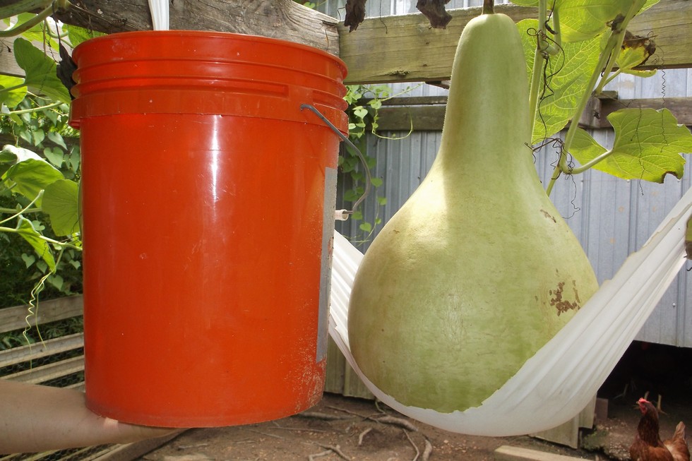 Been growing some Giant Birdhouse Gourds. I grew 9 on the plant this year. They are big. I cannot imagine how big just one would get. 36 1/2 inch circumference.