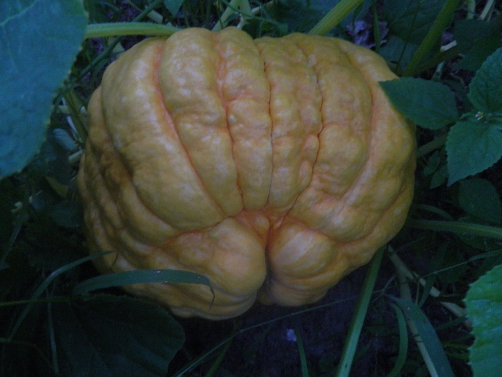 I finally got a few pumpkins to set on the 233 House Cinderella. It never set any male flowers and my pollinations with the 359 Foss all aborted. This is the craziest pumpkin I have seen, but the others look like normal Cinderellas.