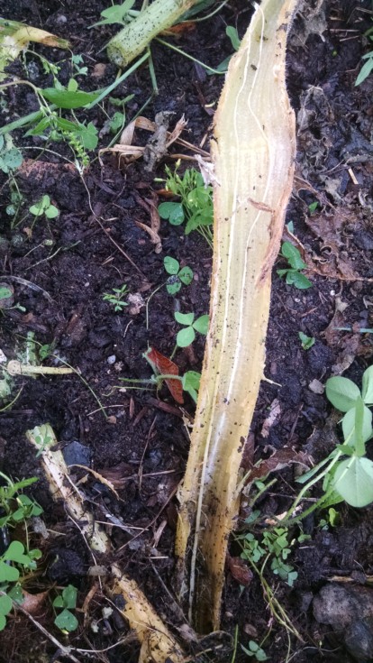 I saw the coolest thing today. While cutting leaves that were rotting/dying/etc., I noticed that one of the leaves had a root growing up through its hollow cavity. I cut a cross-section of it, and it was quite a long root! Once it got to the top of the leaf, it turned back around and continued growing down to the ground. I thought that was pretty cool!