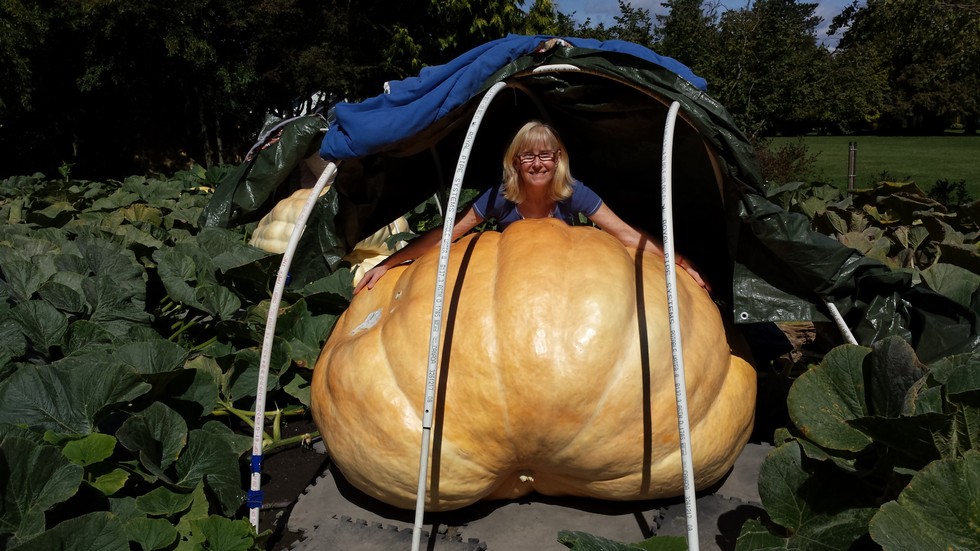 She's still growing !.....the pumpkin that is lol. Thanks to country boy for idea of the picture and thanks to my good wife for being such a good sport. What a ride ! We have 24 days to weigh off at Krause Berry Farms.