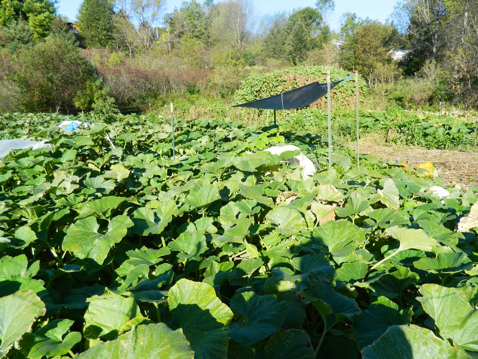 Getting ready to load up. The 1928 Globus, Jacob's pumpkin, had great leaves right up to the end. We quit terminating tertiaries except for the ones getting on the electric fence in late August. The vines got a little crowded the last month.