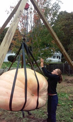 Dale and I built a tripod to lift the pumpkins, and it worked great! At first, we had a piece of rebar holding the pieces of wood together at the top, but it bent when accidentally dropped the structure when we were trying to set it up. Having a bent piece of rebar above your head, pointing directly at you, is very unnerving when you're lifting a 1000 pound object. Dale and I were definitely scared for our lives a few times, but everything went well, and we replaced the rebar with a bolt the second time around.