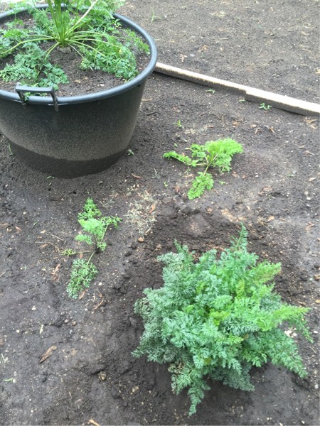 I just couldnt throw her out after all these months so into carrot recovery she went. She is the one in the front. All of these plants have gone thru this rough transplant. The one in the raised pot has been pulled from the ground four times already. These carrots are tough.