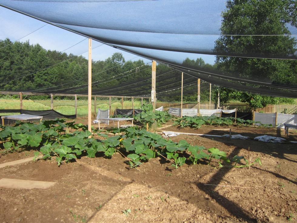 Patch View. Pollinated my 1781 Haist's first female with my youngest 1340 two days ago. The catch is the main on her broke just past the baby but I have left it connected for now and see what happens. This spot in my patch is so jacked up third year in a row with this.