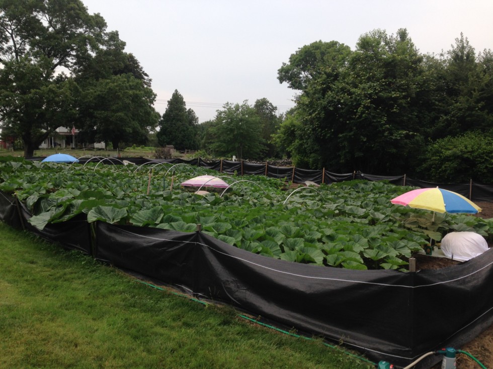 Patch filling in. Took a beating with hail a month back so middle of plants are dying back. Two blossom nubs have rotted off. Let's hope we can get one to the scales this year. Pumpkins are picking up the pace! Cuke beetles have been bad here and it has been tough to control them!