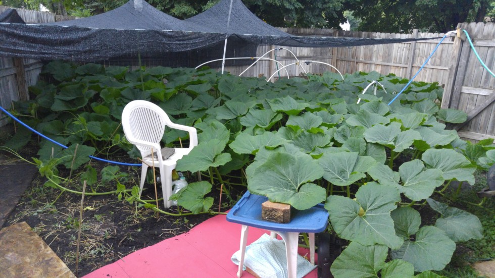 Plant has almost filled in the entire patch. Pumpkin updates will be on day 10. Little hot but the rain was needed.