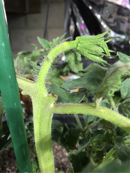 6.23 Megazac weekly update. Blossom is getting bigger. I don't need a magnifying glass to see it now. Sometime in the next week it should be opening. As you can see the stem ribboned just before the blossom. I was unsure how to prune but decided to remove one vine. Wish it was a ribbon direct to the flower like the mother had. I think mega blossoms with ribbon vines might be the next step up in giant tomatoes.
