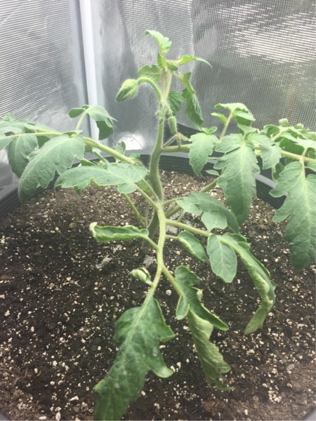 In comparison this tomato is being grown under a 200 watt T-5 ho light. Measuring again with the PAR meter the maximum intensity available is 350 uMols. I have it set it at the height above canopy for maximum. The leaves of this plant do not have the same dark green as the other. The internodal length length is much longer and total leaf mass is less. Soon will have an idea of how it effects the most important quality..fruit weight. Both plants are forming a first truss mega at the same time.
