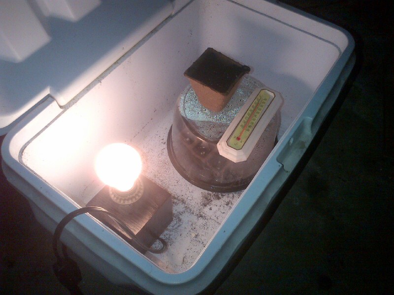 It's hard to see, but inside are 12 peat pots each with a few Chilean Glory Vine seeds. They are a bugger because they need bright light and 85-90 degree temps to germinate and they will take a month or so. It is crude but the light inside the cooler keeps the temp right around 90 degrees. Here is a link to what they look like, worth the effort.