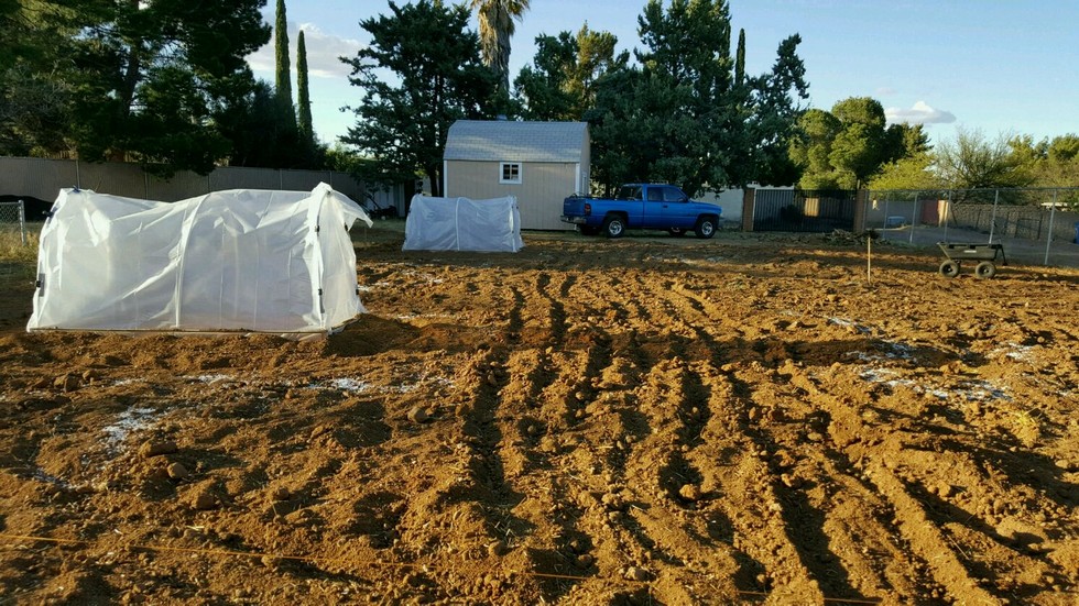 Cloche houses. With 60 degree day soil temp went to 90 ambient 100 plus. Going to place blanket on at night to see what temps I can hold.