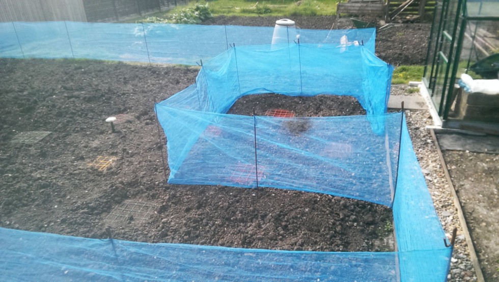 Windbreak is up, nursery area on the right. There's another one at the other end of the plot. Next thing to do is make the cloche and prepare soil for seedlings.