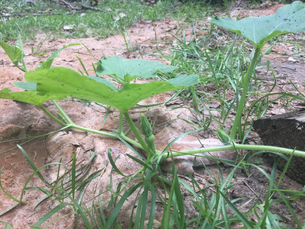 Squash vines in the new garden are healthy and vining, one even has a female flower already. It is shaped like a butternut, but butternut was not one of the varieties in the mix and my actual butternut plant has noticeable different leaves.