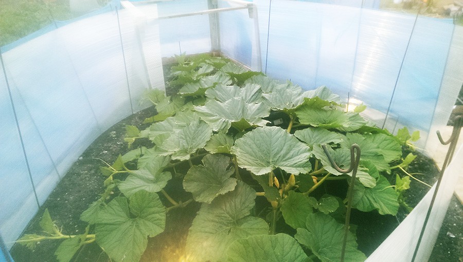This is the 333 showing the polycarbonate screens that are in place for wind protection. They're easily movable and staked out with fencing pins. I move them every day so they always end up being about 1ft from the end of the vines. Development continues to be rapid on all fronts with 6-8" growth per day and female flowers developing on the secondaries, which I pinch off as well as tertiaries. Burying nodes takes a lot of time and it's only going to get worse! I'm still feeding with N but also some extra Ca and P as we're nearing the pollination stage which I expect to occur in the first week of July.