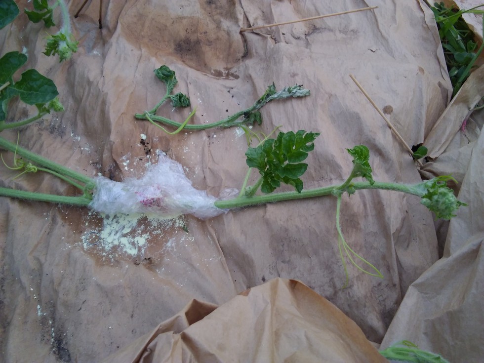 purdy darn excited about my melon plant graft yesterday on my (2)combined 146.5 melon plants. This morning 7/11 looks like the graft is going to take just fine..and I knew it would I've done them so much. So now these 2 plants are grafted at 2 main vines each if and when thee other 2 of the 4 main vines reach each other they too will get grafted but I think having 2 of them grafted is good enough for what I want at this point. Now for a melon to get set past one of those 2 grafted vines. Fingers crossed. I did a very nice gradual cleft graft, clamped with 1 set of clapms over & under of ea. other and a single clamp next to that to hold the graft tight and secure from slipping then I cover with sulfer wrapped in plastic wrap and cover from the sun. The very High Humidity levels right now are perfect for this 100%!