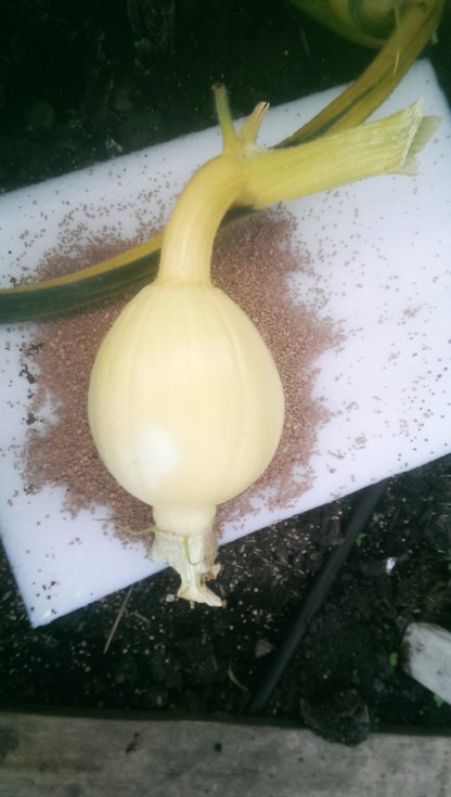 The 333 at 10DAP. I managed to nick it with a fingernail so that's some sulphur powder you can see on top. Underneath is cat litter, the non-clumping expanded clay type. Many of us cactus growers use it in cactus compost, it acts as drainage and it absorbs water. We use it instead sand because it's lighter, doesn't clump, it's non abrasive, pH neutral and drains more freely. I think it will work well under the pumpkin for the same reasons. Recent weather has been cloudy with light showers and the forecast looks the same.
