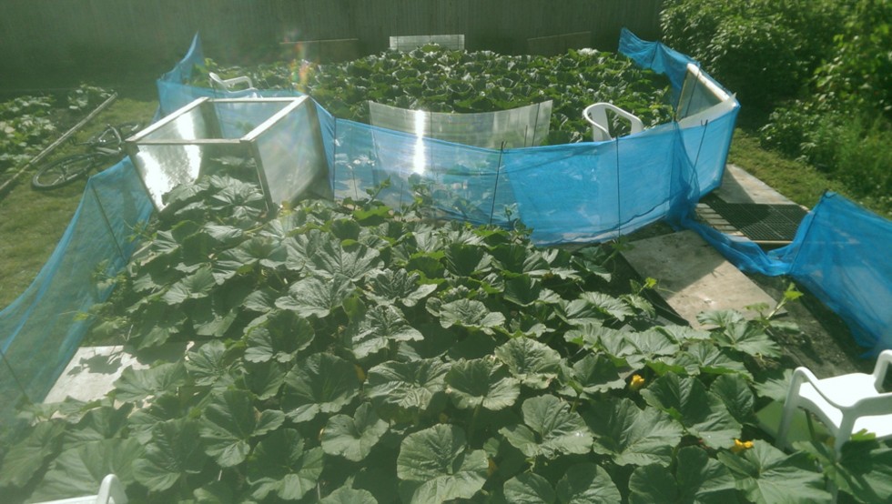 Pumpkin patch this morning. The 333 is at the top of the picture and the transplant at the bottom. Both plants are starting to interfere with each other now so I'm terminating the vines before it becomes a tangled mess. Next year I will only grow one plant on this patch, it's just not big enough for two.
