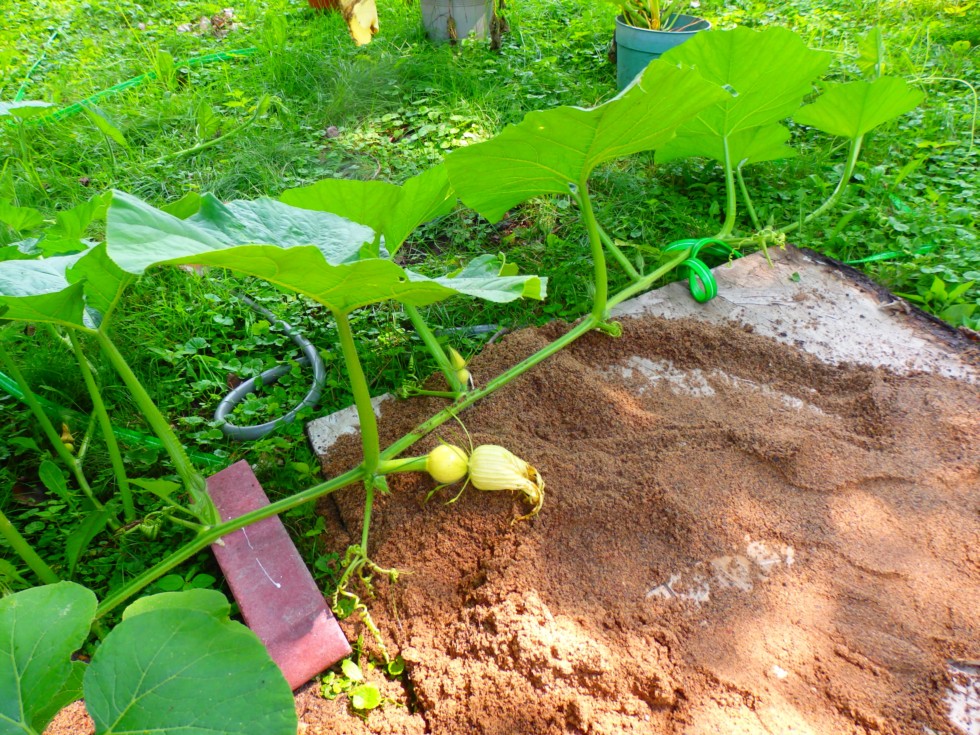 Atlantic Giant possible set 2. Propped up vine with brick to help grow pumpkin upright. Board is used to cover air conditioner during winter months. Sand is from damage sandbags we put in the bed of my wife's truck for traction in the winter. Note another female flower in the background.