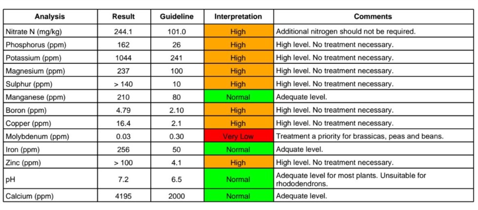 Soil analysis came in today, lots of everything in there, now we just need some sun, warmth & water to provide the means to take it all up. Water isn't a problem but sun and warmth are out of our control.