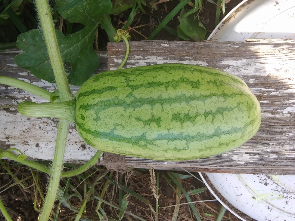 146.5 Melon(2), 32 ott, 3 dap. This one is 1" shorter than the number 1 melon was at 3 dap and 3" less ott of 32". The stem at the melon is twice the size of the 1st melon at just shy of 1" across, really thick in my little experience of these things. Hope that's a good sign. For size comparison that's a 6" wide ship lap board its sitting on. I know its really senseless to be spitting out these numbers so early and know what really matters if they make it to scales!