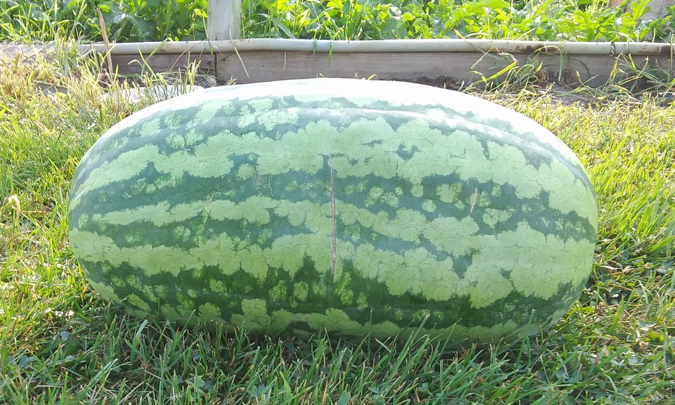 My how things change! I culled this split melon that was growing just fine. 37 pounds 14 dap for another melon that is out growing it by far. The other melon is 7 dap and is growing on the same plant as the one I just culled. It is very very long and fat. Still have 2 melons on. This new one will be refered to as melon (1) and thee other one is melon (2).