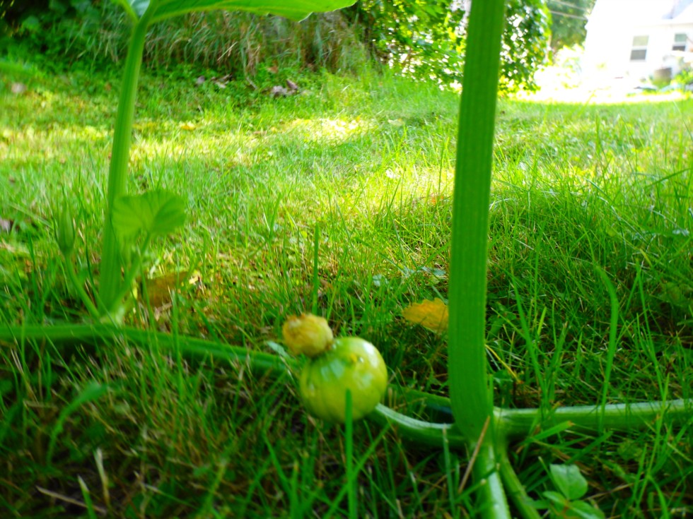 Porcelain Doll Set 1. Looks like it will abort because of bites in pumpkin. Female flower starting to grow a few feet further down the line. First sets always seem to abort for me.