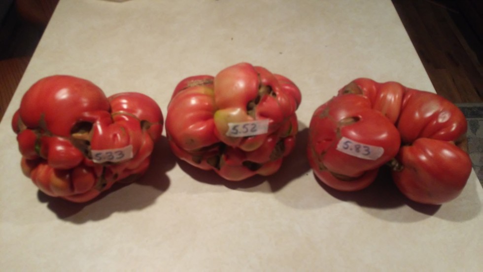 Here are my 3 biggest tomatoes so far. The two smaller ones are from the 6.13 konieczny(megazac) and the 5.83 is from the 6.24 konieczny(megazac) Tim Pennington was the winner of my contest so i willl send him at least 10 seeds from the 5.83 and some seeds from both 6.13 and 6.24 megazac's